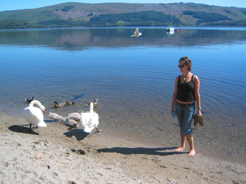We found a beach! Swans join us at the shore of Loch Lomond